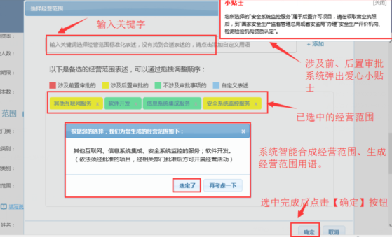 經(jīng)營(yíng)(業(yè)務(wù))范圍經(jīng)營(yíng)范圍提供智能填寫、動(dòng)態(tài)排序、智能分段,填寫完成后,系統(tǒng)即時(shí)整合生成經(jīng)營(yíng)范圍文本,具體操作如下所示;