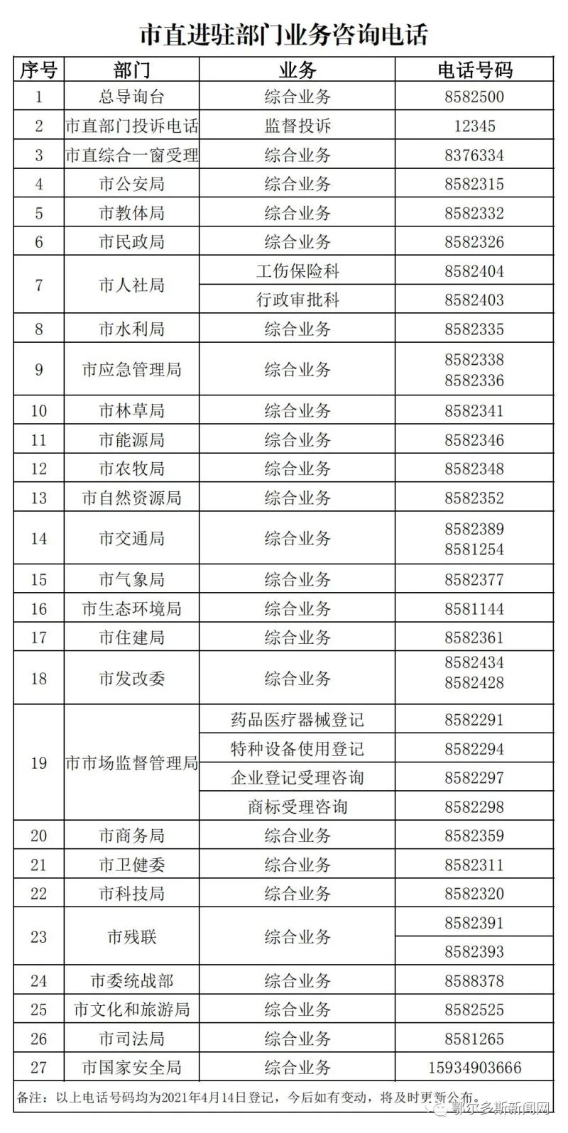 備注:以上電話號(hào)碼均為2019年10月16日登記,市司法局、市文化與旅游局、市國(guó)家安全局暫時(shí)未安裝電話。今后如有變動(dòng),將及時(shí)更新公布。 |