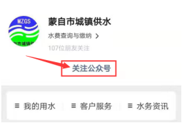1.掃描二維碼關(guān)注蒙自城鎮(zhèn)供水微信公眾號(hào)