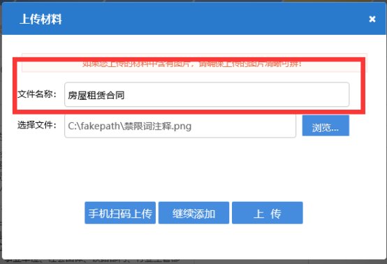 注:需上傳為必須上傳材料,請(qǐng)確保材料掃碼圖片的清晰。如果上傳時(shí)提示“無效的文件名稱”,請(qǐng)修改文件名稱,例如:上傳的是房屋租賃合同直接修改為房屋租賃合同即可(如下圖)