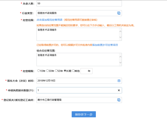 4、填寫基本信息,并保存下一步 注:登記機(jī)關(guān)為您提交的審核機(jī)關(guān),請(qǐng)正確填寫。