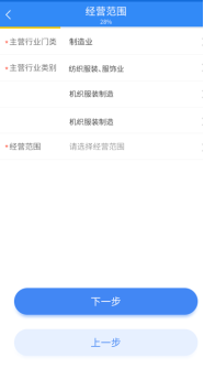 第六步:點擊“經營范圍”項,輸入經營范圍關鍵字,查詢所需經營范圍,在結果清單中點擊某項經營范圍后,選中的第一項默認為“主營范圍”,若已選中的“主營范圍”被刪除,則后續(xù)所選經營范圍會默認設置為“主營范圍”。