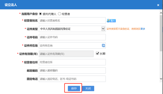 填寫個(gè)體經(jīng)營者信息,*號(hào)為必填項(xiàng),點(diǎn)擊經(jīng)營者的【新增】按鈕,填寫完畢點(diǎn)擊【保存并下一步】按鈕。