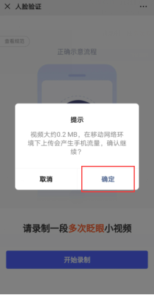 錄制視頻后會(huì)有如下提示,點(diǎn)擊【確定】,食品符合要求會(huì)提示人臉認(rèn)證通過,點(diǎn)擊【完成驗(yàn)證】,即簽名成功。