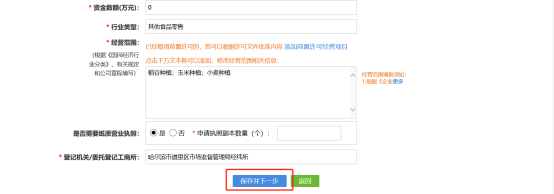 填寫企業(yè)基本信息,*號(hào)為必填項(xiàng),經(jīng)營場所地址精確到門牌號(hào),經(jīng)營范圍不少于6個(gè)字符,點(diǎn)擊【保存并下一步】按鈕。