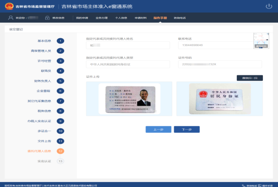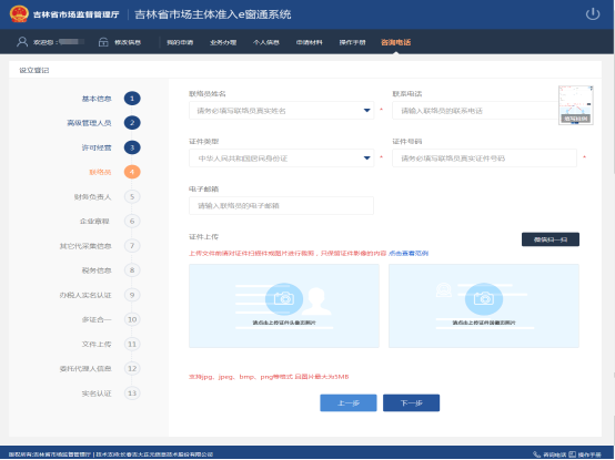14) 選擇“聯(lián)絡(luò)員姓名”,輸入聯(lián)系電話,選擇“證件類型”,輸入“證件號碼”,“證件上傳”,以上都和之前步驟相同,不做舉例。