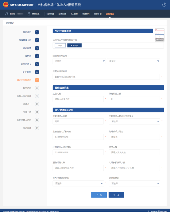 非公黨建信息采集—輸入“主要出資人姓名”,選擇“主要出資人是否為中共黨員”,輸入“黨員人數(shù)”,輸入“預備黨員人數(shù)”,輸入“入黨積極分子人數(shù)”,選擇“是否已組建黨組織”,選擇“黨組織意向”,點擊“下一步”按鈕,如下圖。