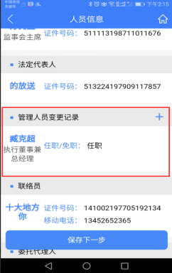 5、 填寫管理人員變更記錄信息,點擊“保存”,回到人員信息頁面