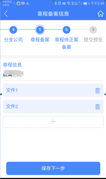 1、 點擊章程備案信息頁面的“+”,進入上傳章程備案頁面上傳章程