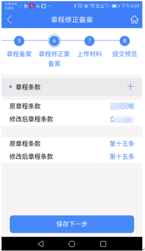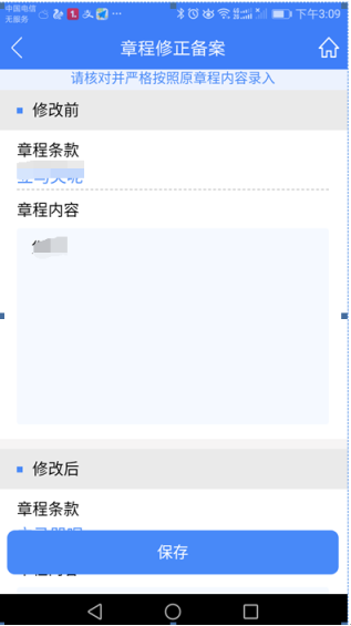 2、 錄入章程條款變更頁面,填寫信息,點擊“保存”,回到列表頁面