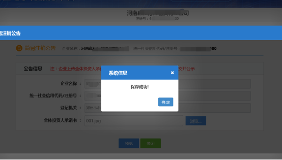 11.點擊保存并公示后,系統(tǒng)檢測到之前有超期未辦理的簡易注銷公告,點擊確定會將上次未辦理簡易注銷業(yè)務(wù)的公告置為無效,并給出保存成功提示。