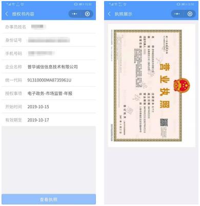 3)如果出示的是辦事人申請(qǐng)使用的電子營(yíng)業(yè)執(zhí)照,掃描二維碼后,可以看到該辦事人被授權(quán)的詳細(xì)信息,點(diǎn)擊“查看執(zhí)照”查看授權(quán)執(zhí)照的執(zhí)照樣式。