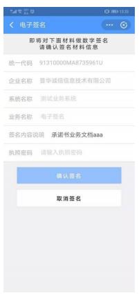 4)電子營(yíng)業(yè)執(zhí)照小程序或 APP接收到簽名數(shù)據(jù)后,輸入執(zhí)照密碼,進(jìn)行電子簽名。