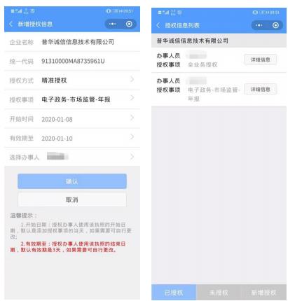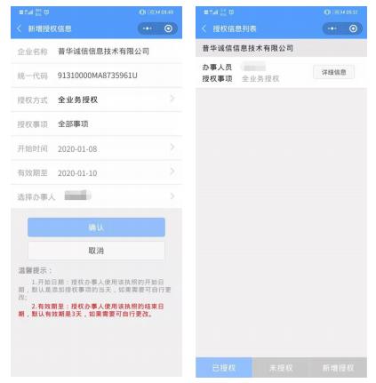 法定代表人或者擁有“下級(jí)授權(quán)”權(quán)限的證照管理員錄入授權(quán)信息并選擇被授權(quán)的辦事人(如果該辦事人不在列表中,或者企業(yè)沒(méi)有辦事人,則需要添加),授權(quán)信息保存成功后,辦事人可以去下載相應(yīng)的執(zhí)照,還未生效的授權(quán)信息可以下載,但不可使用。
