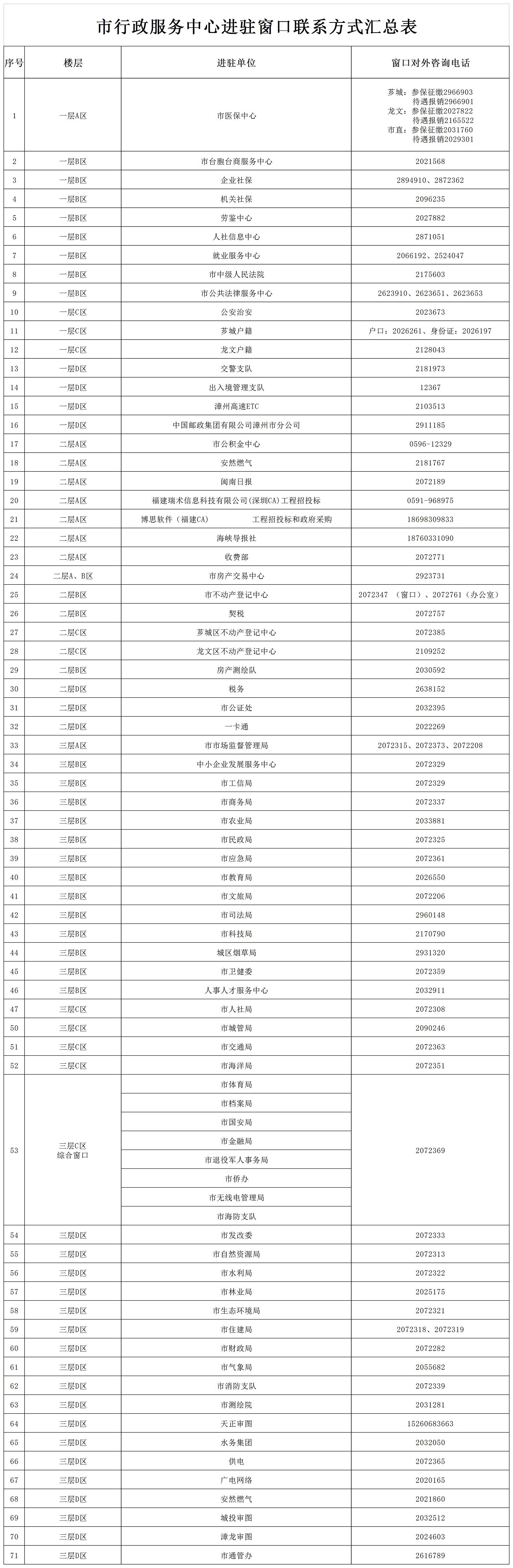 漳州市行政服務(wù)中心進(jìn)駐窗口預(yù)約聯(lián)系方式匯總表