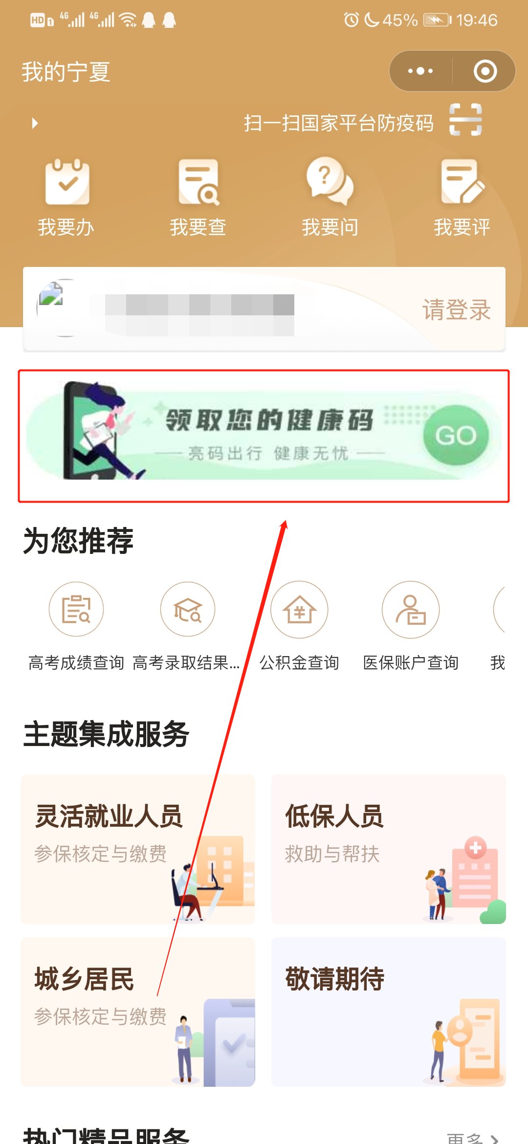 2.進入小程序后,點擊小程序主頁中的“領(lǐng)取您的健康碼”;
