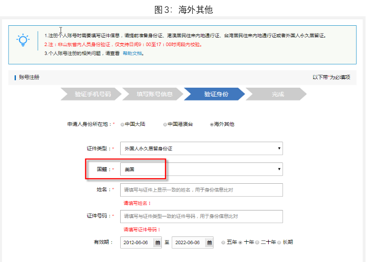4.在身份驗(yàn)證環(huán)節(jié)中,申請(qǐng)人身份所在地會(huì)涉及到三種,分別是中國大陸、中國港澳臺(tái)、海外其他,申請(qǐng)人身份所在地選擇中國大陸,可以通過身份證進(jìn)行身份驗(yàn)證;申請(qǐng)人身份所在地選擇中國港澳臺(tái),可以通過“港澳居民來往內(nèi)地通行證”和“臺(tái)灣居民來往大陸通行證”進(jìn)行身份驗(yàn)證;申請(qǐng)人身份所在地在海外其他,可以通過“外國人永久居留身份證”進(jìn)行身份驗(yàn)證。