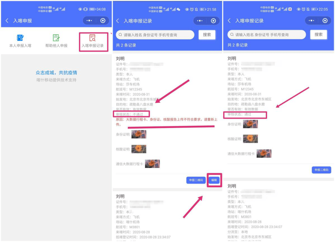 5、申報人在“入喀申報記錄”查詢申報通過狀態(tài)。(①審核通過:說明申報人填寫資料詳實、符合要求;②審核不通過:平臺會就未通過原因作出說明,申報人點擊“編輯”,對申報信息進(jìn)行修改完善,平臺再次審核,若信息上傳完整,給予通過)