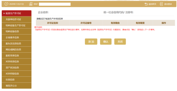 第五步:進(jìn)入疫苗生產(chǎn)許可證頁面,展示疫苗生產(chǎn)許可證信息。點(diǎn)擊添加填寫點(diǎn)擊保存。若沒有疫苗生產(chǎn)許可證的企業(yè)可直接點(diǎn)擊確認(rèn)進(jìn)入下一頁。