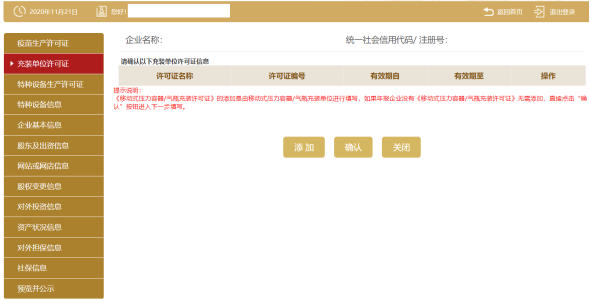 步:進(jìn)入充裝單位許可證頁面,展示充裝單位許可證信息。點(diǎn)擊添加填寫點(diǎn)擊保存。若沒有充裝單位許可證的企業(yè)可直接點(diǎn)擊確認(rèn)進(jìn)入下一頁。