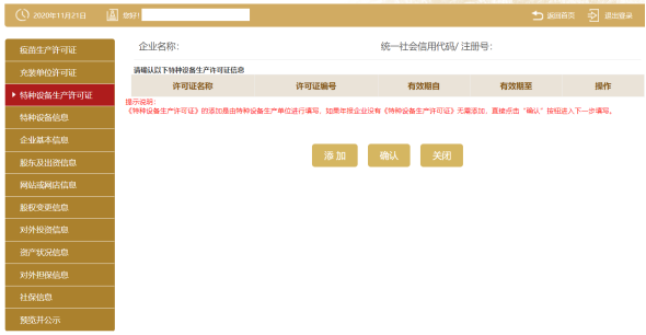 步:進(jìn)入特種設(shè)備生產(chǎn)許可證頁面,展示特種設(shè)備生產(chǎn)許可證信息。點(diǎn)擊添加填寫點(diǎn)擊保存。若沒有特種設(shè)備生產(chǎn)許可證的企業(yè)可直接點(diǎn)擊確認(rèn)進(jìn)入下一頁。