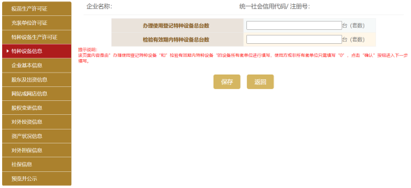 步:進(jìn)入特種設(shè)備信息頁面,填寫點(diǎn)擊保存。若沒有特種設(shè)備信息的企業(yè)可填寫0。