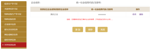 十一步:進(jìn)入對(duì)外投資信息頁面。可添加多條對(duì)外投資信息,也可修改或刪除信息。