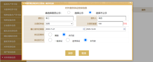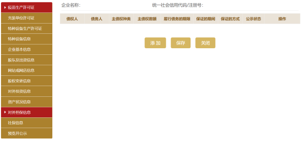 步:進(jìn)入對(duì)外擔(dān)保信息頁面??商砑佣鄺l對(duì)外擔(dān)保信息,也可修改或刪除信息。