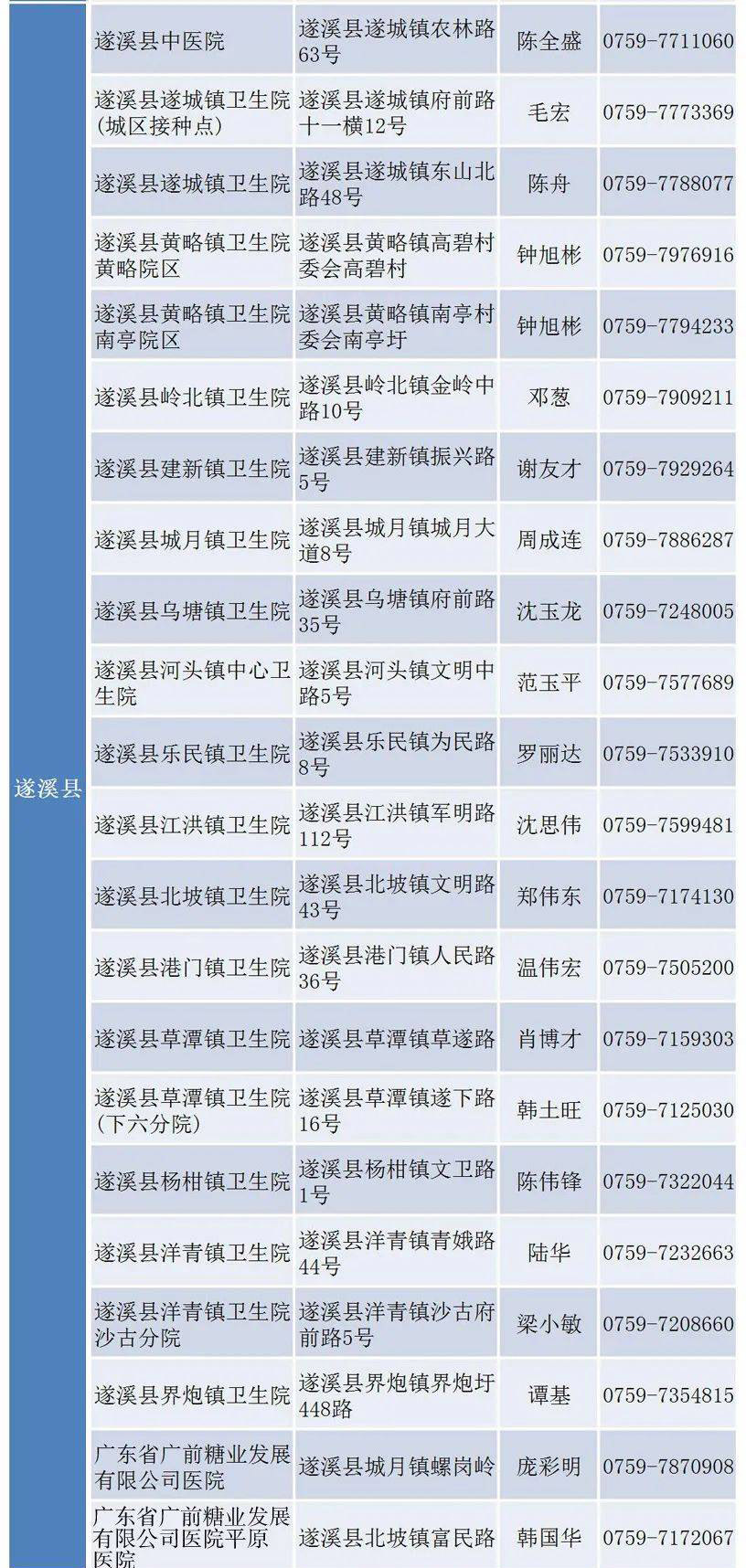 按照國(guó)家、省、市相關(guān)工作要求,遂溪縣已陸續(xù)開(kāi)展對(duì)重點(diǎn)人群和其他人群新冠病毒疫苗接種工作。近日,遂溪縣衛(wèi)健委公布我縣新冠病毒疫苗預(yù)防接種點(diǎn)。目前,遂溪縣共有22家機(jī)構(gòu)可供市民預(yù)約接種新冠病毒疫苗。詳細(xì)單位名單、地址、接種時(shí)間和預(yù)約電話等信息看這里↓↓↓