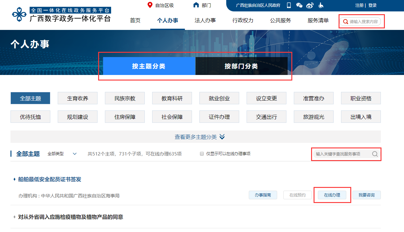 您可以通過事項(xiàng)類型,事項(xiàng)主題分類等方式快速鎖定事項(xiàng),也可以通過關(guān)鍵詞快速檢索。