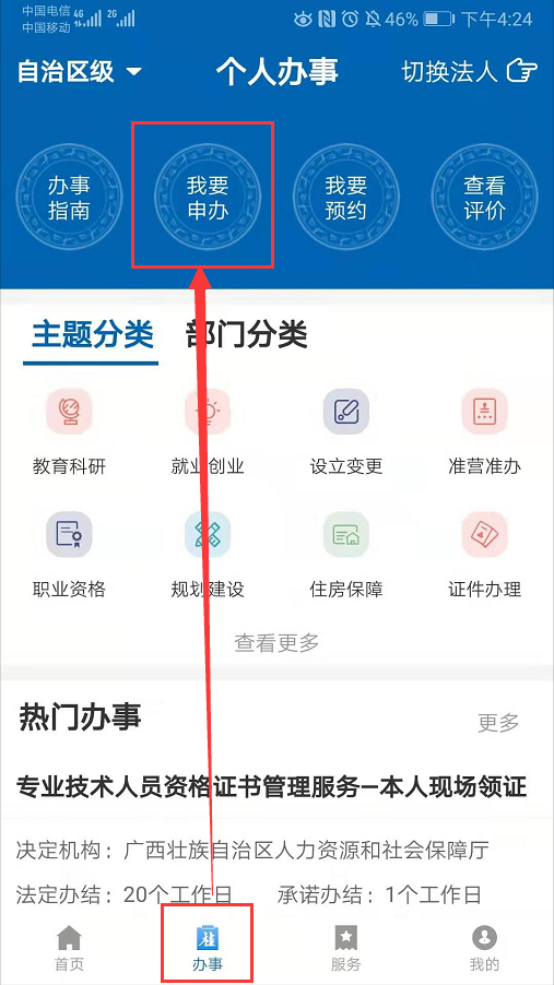 第四步:在“首頁”搜索對應(yīng)事項(xiàng)或者點(diǎn)擊下方“辦事”菜單查詢辦事指南進(jìn)行申報(bào)。