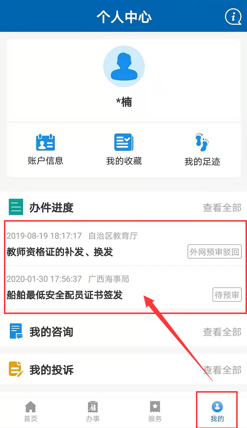 第六步:底部“我的”菜單里查詢辦件進(jìn)度。