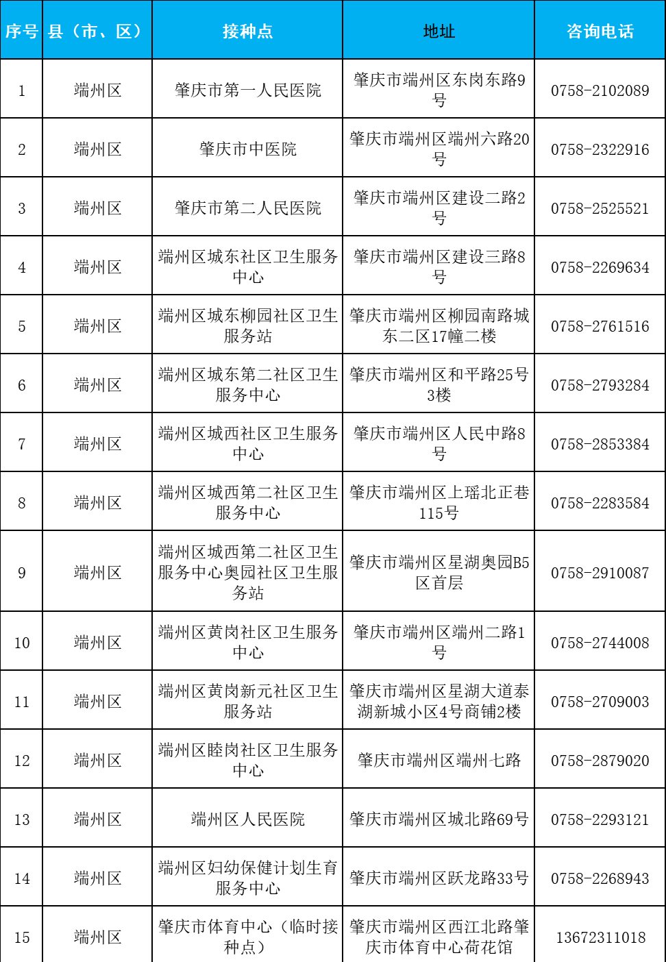 肇慶市端州區(qū)新冠病毒疫苗接種點(diǎn)及預(yù)約咨詢電話