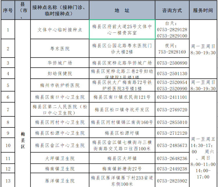 梅州市梅縣區(qū)新冠病毒疫苗接種點信息