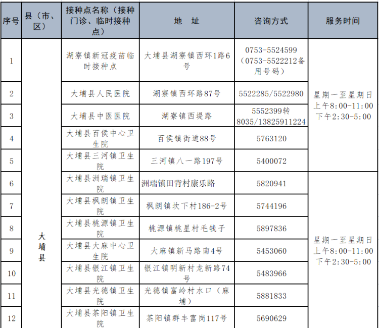 大埔縣新冠病毒疫苗接種點(diǎn)及預(yù)約咨詢(xún)電話(huà)