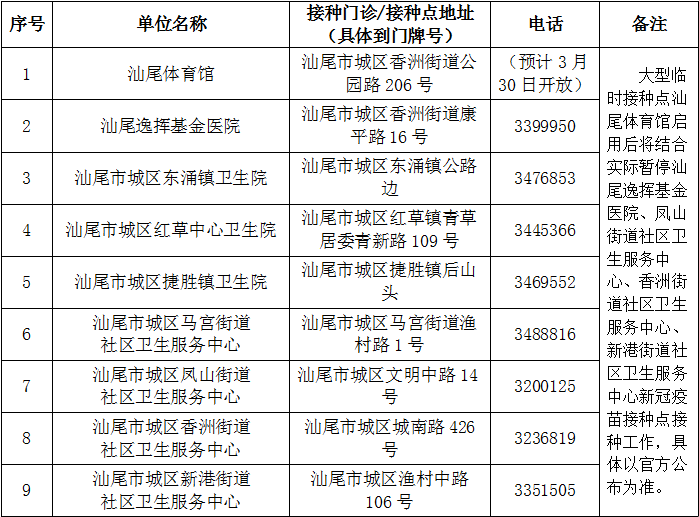 汕尾市城區(qū)新冠病毒疫苗接種點信息