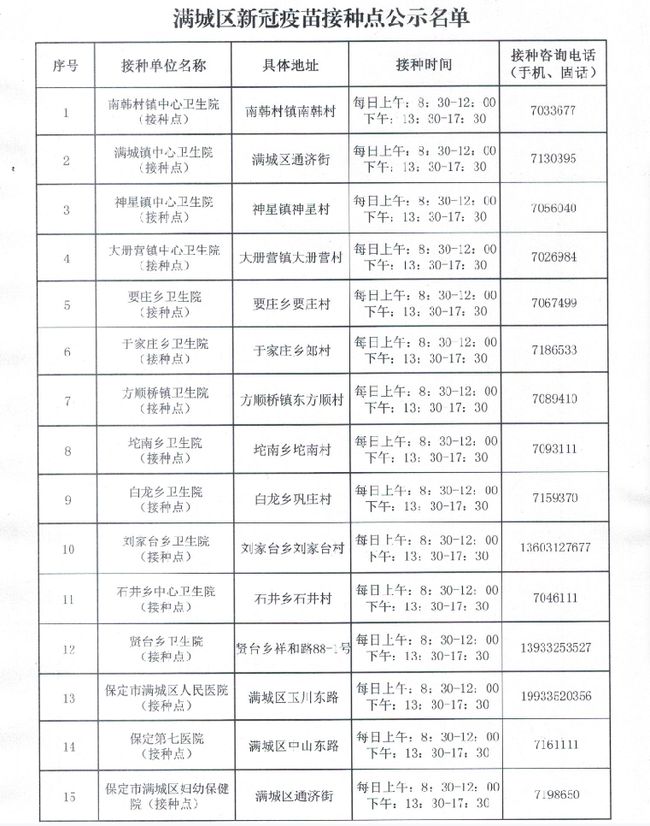 一、保定市滿城區(qū)新冠病毒疫苗接種點(diǎn)信息
