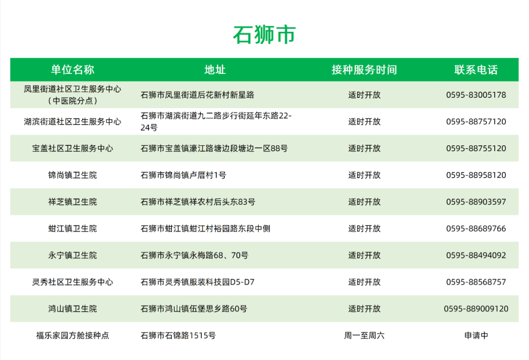 接種地點(diǎn):福建省泉州市石獅市鴻山鎮(zhèn)伍堡村思鄉(xiāng)路60號(hào)