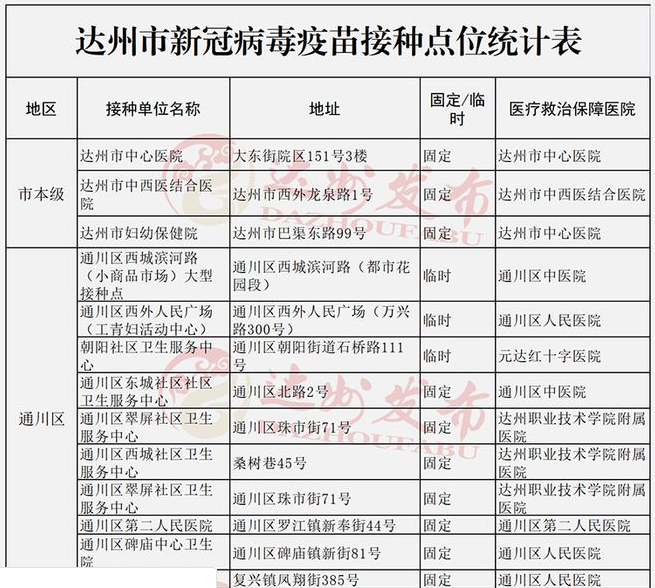 達(dá)州市通川區(qū)新冠病毒疫苗接種點(diǎn)信息
