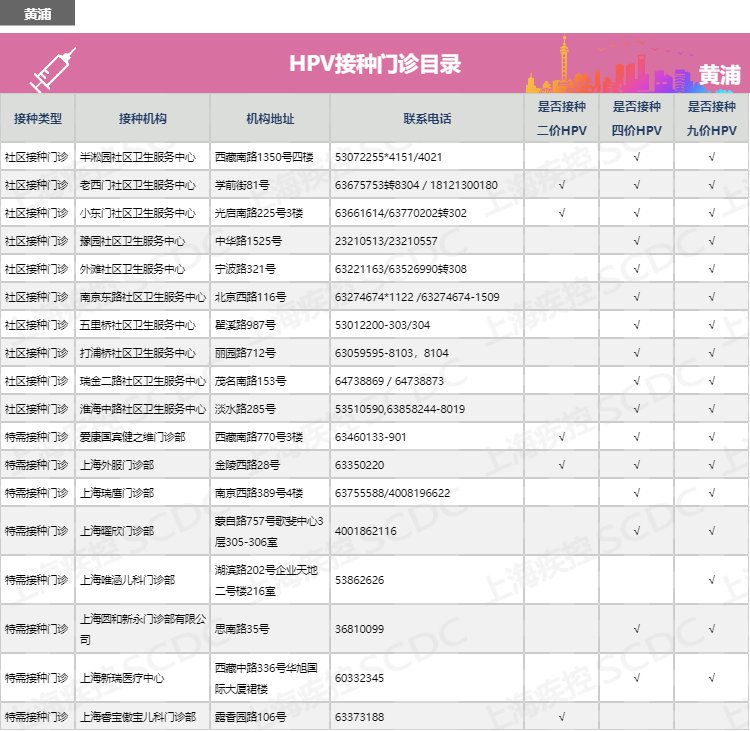 | 【導(dǎo)讀】:上海市黃浦區(qū)如何預(yù)約HPV二價、四價、九價宮頸癌疫苗?黃浦區(qū)宮頸癌疫苗接種點有哪些?有哪些醫(yī)院門診可以接種HPV疫苗?黃浦區(qū)宮頸癌疫苗預(yù)約電話多少?上海疾控中心公布黃浦區(qū)hpv疫苗預(yù)約接種點地址、電話、服務(wù)時間、網(wǎng)上預(yù)約流程及注意事項。有需要接種hpv疫苗的市民可咨詢了解: |