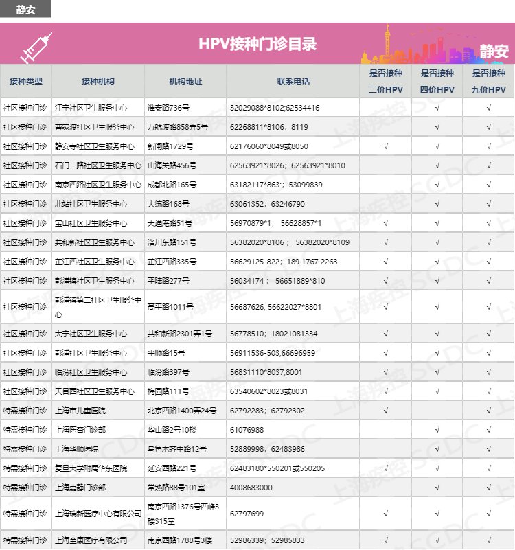 【導(dǎo)讀】:上海市靜安區(qū)如何預(yù)約HPV二價(jià)、四價(jià)、九價(jià)宮頸癌疫苗?靜安區(qū)宮頸癌疫苗接種點(diǎn)有哪些?有哪些醫(yī)院門(mén)診可以接種HPV疫苗?靜安區(qū)宮頸癌疫苗預(yù)約電話(huà)多少?上海疾控中心公布靜安區(qū)hpv疫苗預(yù)約接種點(diǎn)地址、電話(huà)、服務(wù)時(shí)間、網(wǎng)上預(yù)約流程及注意事項(xiàng)。有需要接種hpv疫苗的市民可咨詢(xún)了解: |