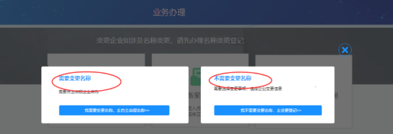 當(dāng)我們點(diǎn)擊“變更登記”后,即將進(jìn)入“公司變更登記”頁(yè)面,此時(shí),我們要根據(jù)實(shí)際情況選擇是否需要變更企業(yè)名稱,以進(jìn)入不同的變更流程。如圖所示。