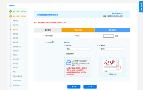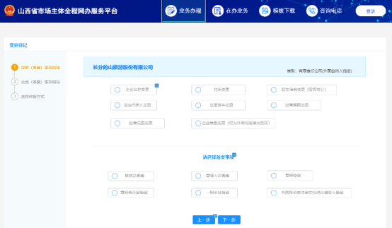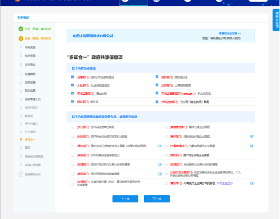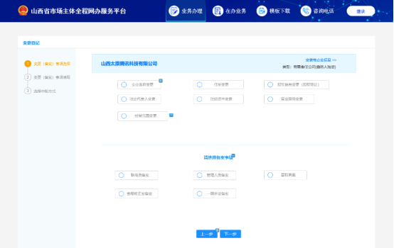 點(diǎn)擊“下一步”,進(jìn)入“變更(備案)事項(xiàng)填寫”步驟,我們需要對(duì)所勾選的變更事項(xiàng)和備案事項(xiàng)逐一填寫。