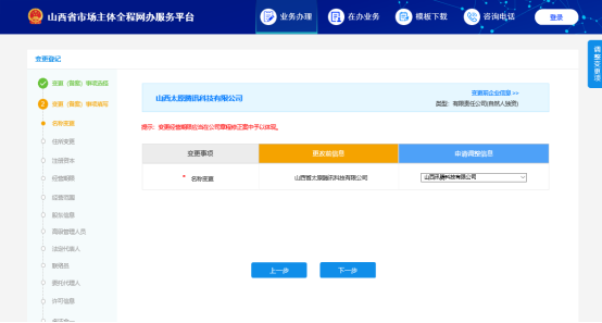 進(jìn)入企業(yè)名稱變更頁(yè)面,我們可以看到變更前的企業(yè)名稱,并在申請(qǐng)調(diào)整信息中,可以查看到該企業(yè)所有已通過(guò)名稱變更自主申報(bào)的有效名稱,我們選擇其中一個(gè)作為變更后的企業(yè)名稱。點(diǎn)擊“下一步”,進(jìn)入后續(xù)事項(xiàng)填寫。如圖所示。