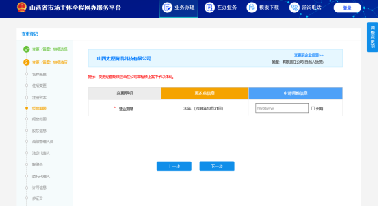 進(jìn)入經(jīng)營(yíng)期限變更頁(yè)面,我們可以看到變更前的經(jīng)營(yíng)期限,并需要在申請(qǐng)調(diào)整信息位置,填寫變更后的經(jīng)營(yíng)期限。點(diǎn)擊“下一步”,進(jìn)入后續(xù)事項(xiàng)填寫。如圖所示。