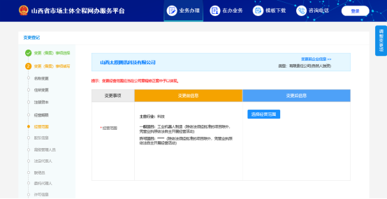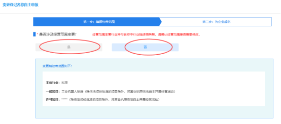 由于企業(yè)經(jīng)營(yíng)范圍中的主營(yíng)行業(yè)與企業(yè)名稱中的行業(yè)描述相關(guān)聯(lián),因此我們?cè)谧兏髽I(yè)名稱時(shí),需要先選擇是否涉及經(jīng)營(yíng)范圍變更,如圖所示。