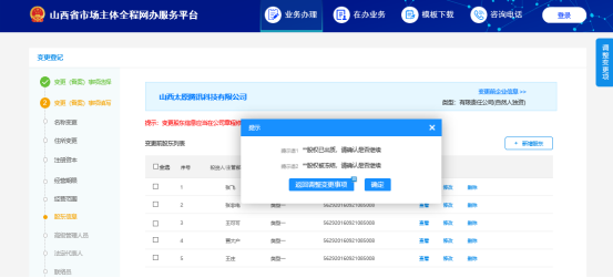 進(jìn)入股東信息變更頁(yè)面時(shí),系統(tǒng)會(huì)校驗(yàn)當(dāng)前的股東是否有涉及股權(quán)出質(zhì)或股權(quán)凍結(jié)的情況,如涉及此類情況,系統(tǒng)會(huì)彈出相應(yīng)的提示,我們選擇是否要繼續(xù)進(jìn)行股東信息變更。如需要繼續(xù)變更,點(diǎn)擊“確定”繼續(xù)填寫,如不再繼續(xù)變更,點(diǎn)擊“返回調(diào)整變更事項(xiàng)”頁(yè)面,取消勾選股東信息變更項(xiàng)后,再繼續(xù)填寫。