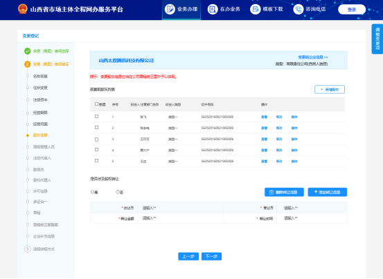 我們根據(jù)實(shí)際情況調(diào)整股東的相關(guān)信息,調(diào)整后的股東信息需要滿足公司股東的相關(guān)要求,且所有股東的認(rèn)繳出資額需要等于注冊(cè)資本,如涉及股權(quán)轉(zhuǎn)讓,需要添加轉(zhuǎn)讓信息。如圖所示。