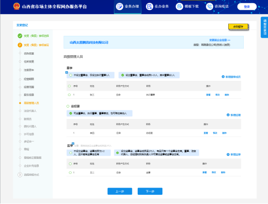 進(jìn)入高級(jí)管理人員變更頁(yè)面,我們可以看到變更前的全部高級(jí)管理人員,我們可以對(duì)管理人員的信息進(jìn)行修改,以及調(diào)整管理人員,當(dāng)變更管理人員時(shí)會(huì)對(duì)法定代表人有影響,需要返回變更(備案)事項(xiàng)選擇頁(yè)面,勾選法定代表人變更事項(xiàng),否則無(wú)法變更擔(dān)任法定代表人的管理人員。點(diǎn)擊“下一步”,進(jìn)入后續(xù)事項(xiàng)填寫。如圖所示。