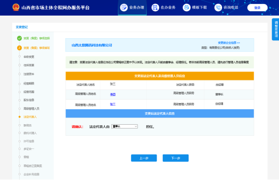 進(jìn)入法定代表人變更頁(yè)面,我們可以看到變更前的法定代表人及高級(jí)管理人員信息,由于法定代表人只能由董事長(zhǎng)/執(zhí)行董事或總經(jīng)理?yè)?dān)任,因此我們直接選擇擔(dān)任法定代表人的管理人員即可,如委派的法定代表人不在已有高級(jí)管理人員中,需要返回變更(備案)事項(xiàng)選擇頁(yè)面,勾選高級(jí)管理人員變更事項(xiàng),在變更完高級(jí)管理人員后,再對(duì)法定代表人進(jìn)行變更。點(diǎn)擊“下一步”,進(jìn)入后續(xù)事項(xiàng)填寫。如圖所示。